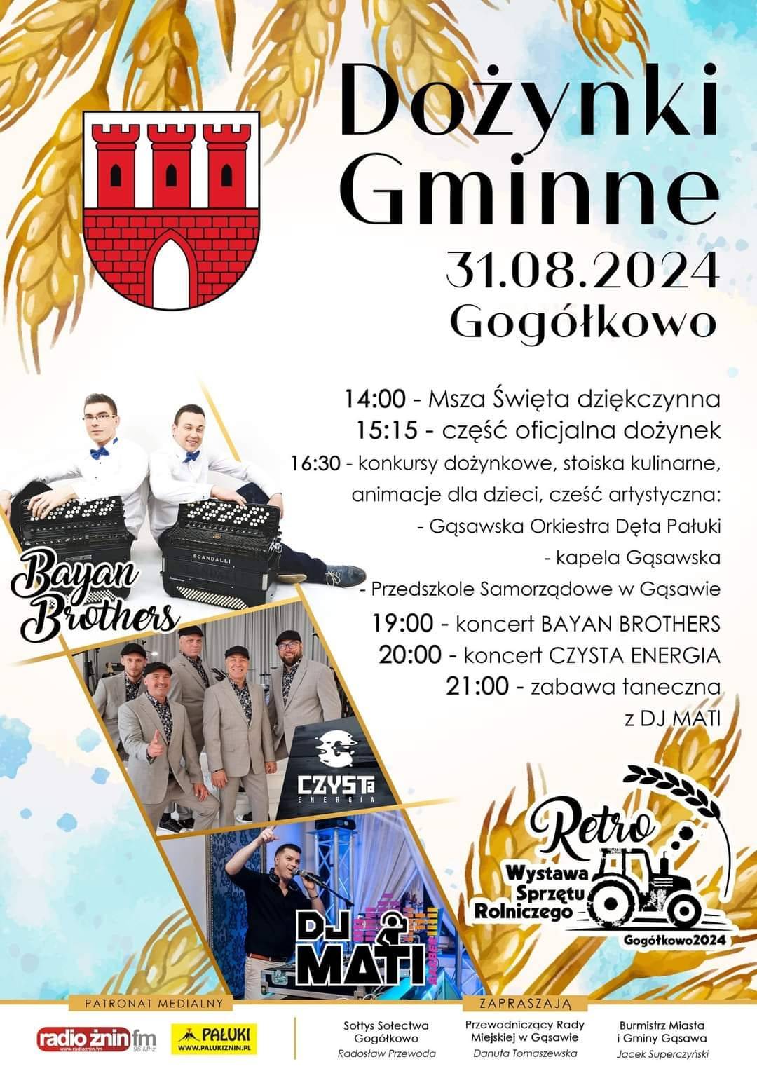 Burmistrz Miasta i Gminy Gąsawa wraz z sołtysem sołectwa Gogółkowa i przewodniczącą Rady Miejskiej w Gąsawie serdecznie zapraszaja na dożynki gminne, które rozpoczna się o godzinie 14:00 mszą świętą dziękczynną.
