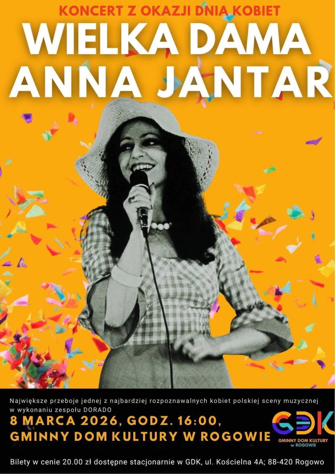 Serdecznie zapraszamy na koncert z okazji Dnia Kobiet „Wielka Dama – Anna Jantar”, który odbędzię się dnia 8 marca w Gminnym Domu Kultury w Rogowie.